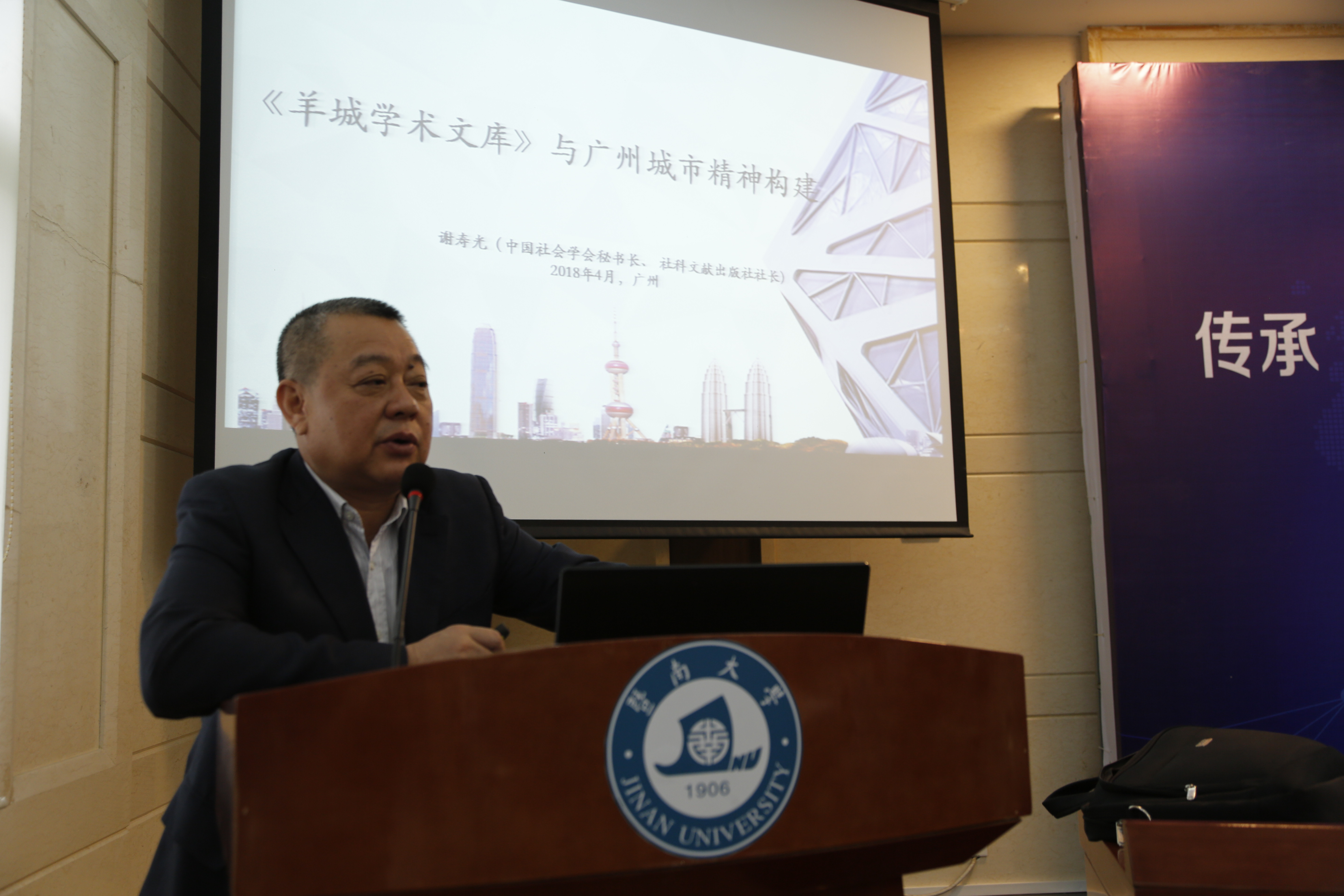 谢寿光社长首先发表了“《羊城学术文库》与广州城市精神构建”的主题演讲。他提到,城市精神由全体市民共同创造和构建,而学术精英为主体的学术出版活动是城市精神构建的重要抓手和平台。他对《羊城学术文库》的出版提出了几点建议:城市研究是构建城市精神的前提和基础,《羊城学术文库》必须建立在全面深入的广州研究的基础之上;在空间上聚焦于广州,从多个视角、用多学科理论方法做全方位深入研究;在时间上应该着眼于广州的历史、现状和未来;结合广州建设国际化大都市的发展战略和城市定位,改进和完善文库的征稿、评审和出版机制;同时还要通过文库的宣传和传播活动来弘扬城市精神。