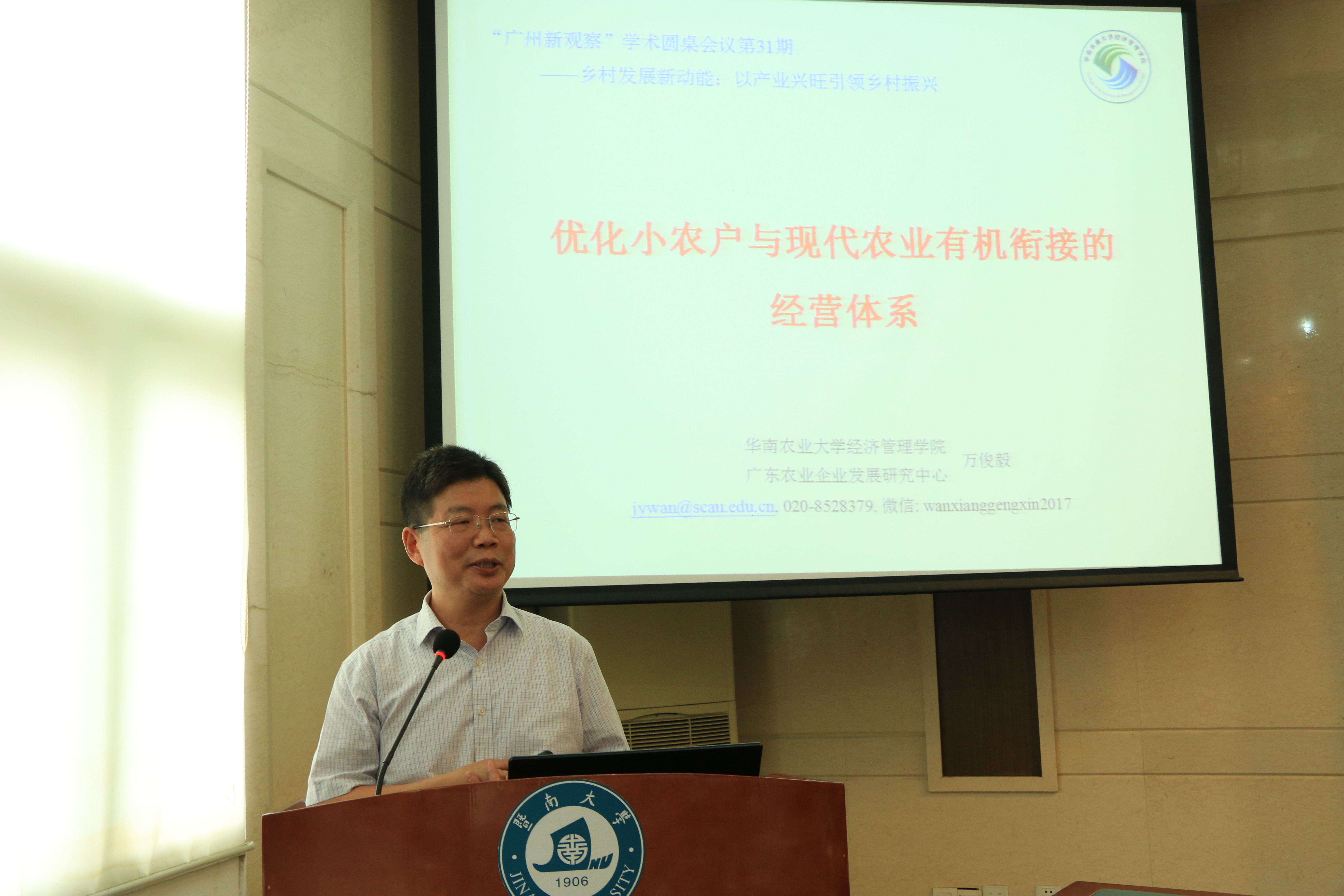 会议由广州市社科联副主席谭晓红主持,来自政府、学界以及企业界的六位嘉宾结合会议主题与行业经验做了主题演讲。六位演讲嘉宾分别是:广东省委农村工作办公室副主任刘洪盛,原中国社会科学院农村发展研究所所长、教授李周,华南农业大学经济管理学院院长、博导万俊毅,广东农科院农业经济与农村发展研究所副所长、研究员万忠,广州市社科院经济研究所所长、研究员郭艳华,广东广垦畜牧集团股份有限公司党委副书记、总经理曾征民。来自华南农业大学经济管理学院、暨南大学新闻与传播学院师生50余人参加了会议。