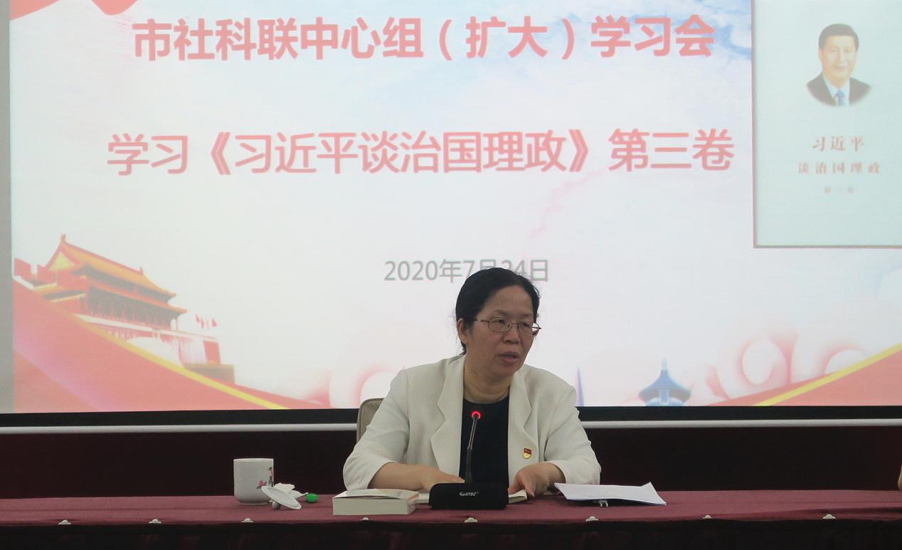 7月24日上午,市委宣传部常务副部长,市社科联党组书记、主席曾伟玉同志主持召开党组理论学习中心组(扩大)学习会,专题学习《习近平谈治国理政》第三卷,党组成员、专职副主席谭晓红、郭德焱同志出席学习并作交流发言,市社科联机关和城市观察杂志社全体党员参加了学习会。