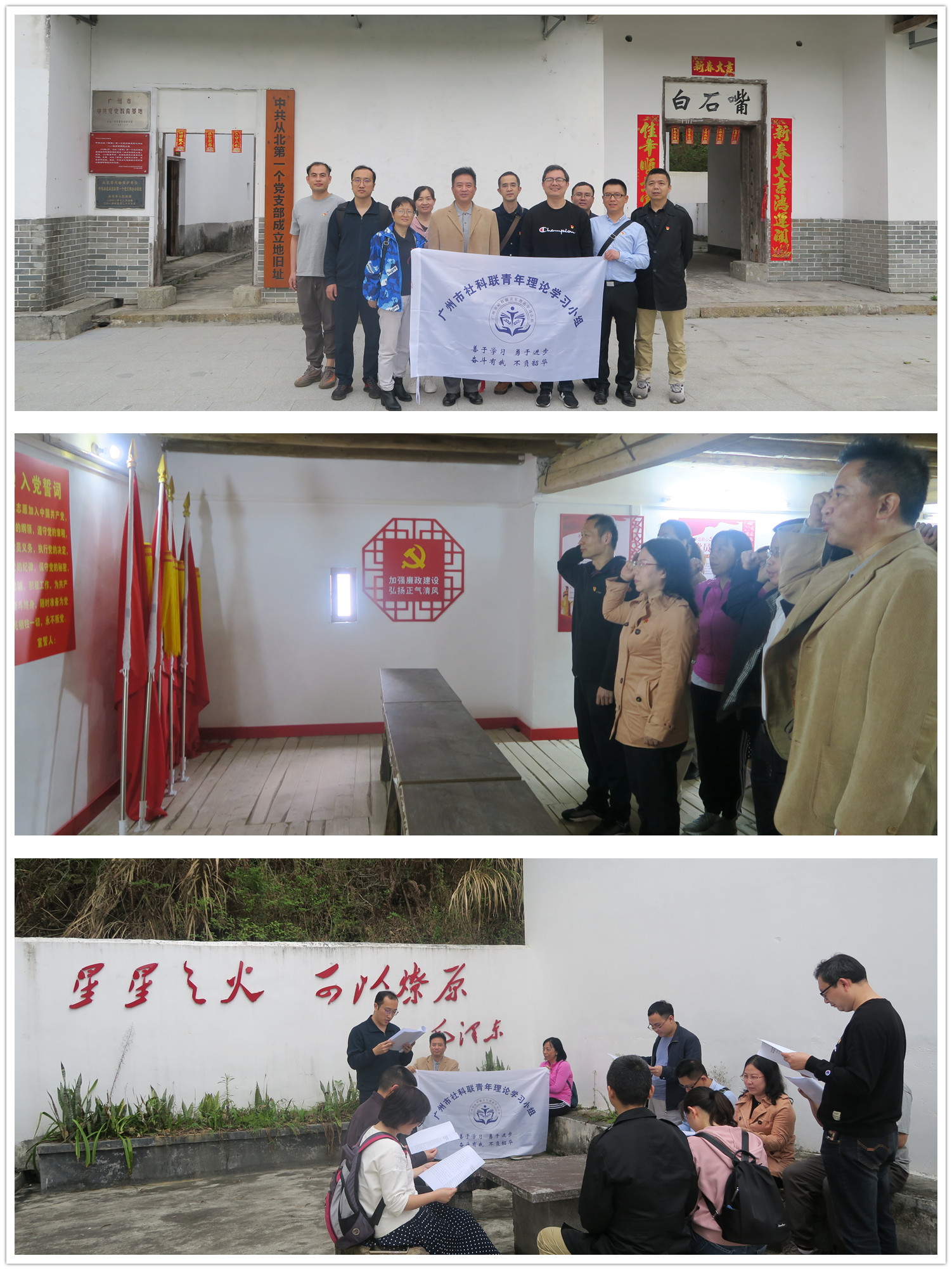 活动的第一站,青年理论学习小组来到了从化吕田镇三村从北(吕田)第一个党支部成立地旧址——白石嘴胡氏公屋。在这座泥砖木结构的两层建筑里,大家认真聆听吕田三村村委会胡主任的介绍讲解,学习了解从北地区党组织创立及发展壮大的历史,并在谭晓红同志的带领下,面向鲜红党旗,重温入党誓词。随后,学习小组在这个80多年前举办过党训班的地方,传达学习习近平总书记在党史学习教育动员大会、中央党校(国家行政学院)中青年干部培训班开班式、全国脱贫攻坚总结表彰大会以及中共中央政治局第二十八次集体学习时的重要讲话精神,唱响新时代的声音,学习党的创新理论。