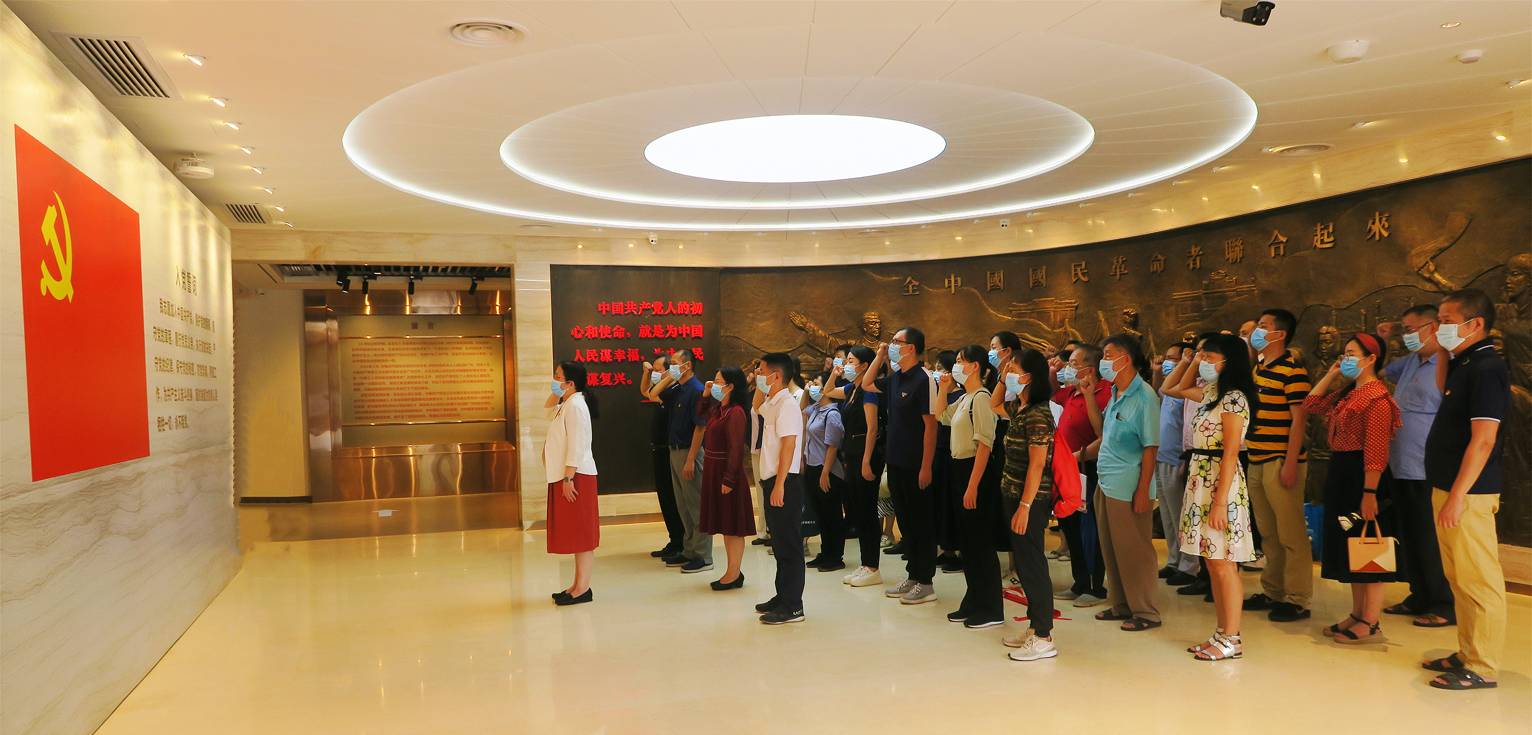 纪念馆大厅的正面墙壁上,鲜红的巨幅党旗庄严高悬,旁边镌刻着入党誓词。参观开始前,在曾伟玉同志带领下,全体党员重温入党誓词。“我志愿加入中国共产党……”所有人凝视党旗,高举右拳,铿锵有力地宣读誓词,让初心和使命再次铭刻于心。