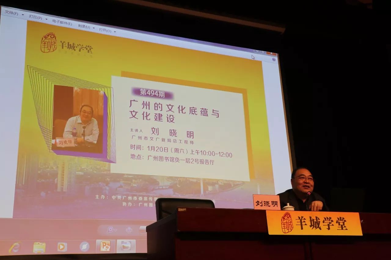 2018年1月20日,学术季“新成就 · 新未来——羊城学堂系列讲座”邀请了广州市文化广电新闻出版局总工程师刘晓明,来到广州图书馆负一层2号报告厅进行了主题为《广州的文化底蕴与文化建设》的讲座,他从“岭南文化中心地”“海上丝绸之路的发祥地”“近现代革命的策源地”“改革开放前沿地”四个方面向市民朋友介绍了广州文化的底蕴,并分享了改革开放以来,公共文化设施得到快速的发展,它们如何成为广州城市文化发展的重要载体。