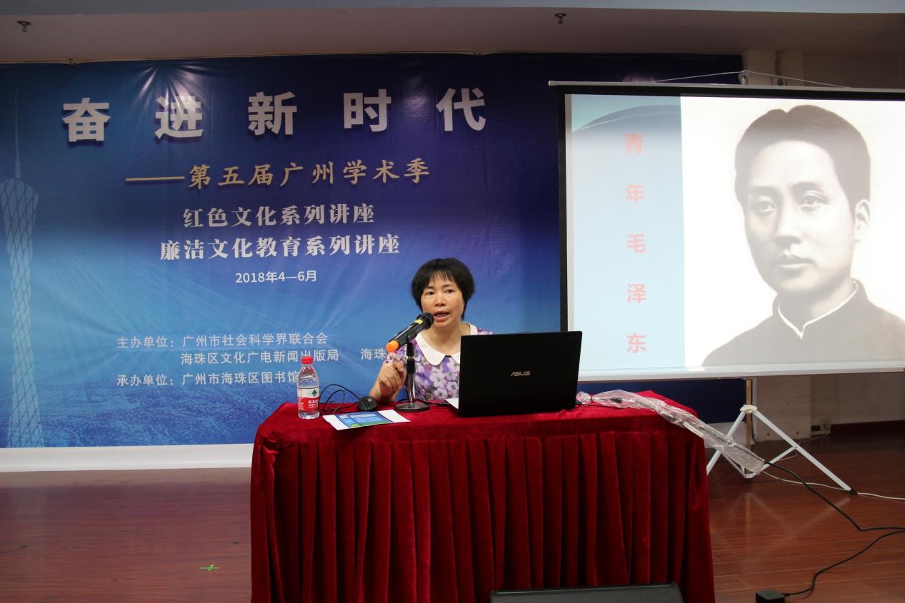 5月13日上午,由广州市社会科学界联合会主办、海珠区图书馆承办的第五届广州学术季红色文化系列讲座在海珠区少年儿童图书馆举行了第5期。广州市党史研究室副主任廖惠霞给我们带来了题为《毛泽东早年在广州的革命活动》的讲座,海珠区全民健身中心党员干部、海珠区业余体校党员干部、广州市海珠区商业职业学校、广州市蓝天中学、海珠区土华小学、海珠区瀛洲小学等学校的党员教师、华南农业大学部分学生、本馆读者等110多名观众参加了本期讲座。