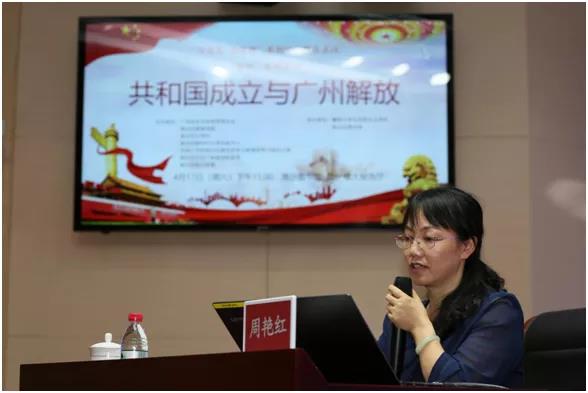 周艳红以《共和国成立与广州解放》为主题进行了精彩授课。她重点围绕中华人民共和国成立、中央为解放广州作出的部署、广州迎接解放、广州回到人民手中、广州成为改革开放的排头兵、新时代的广东担当六个方面逐一展开,内容既贯彻习近平总书记在党史学习教育动员大会上的重要讲话精神,又紧密结合广州解放、发展建设的历史,通过成立首个国营河鲜货栈、举办首届广交会、兴建白天鹅宾馆等真实事例,展现了广州四十多年来如何逐步发展成为改革开放前沿的历程。
