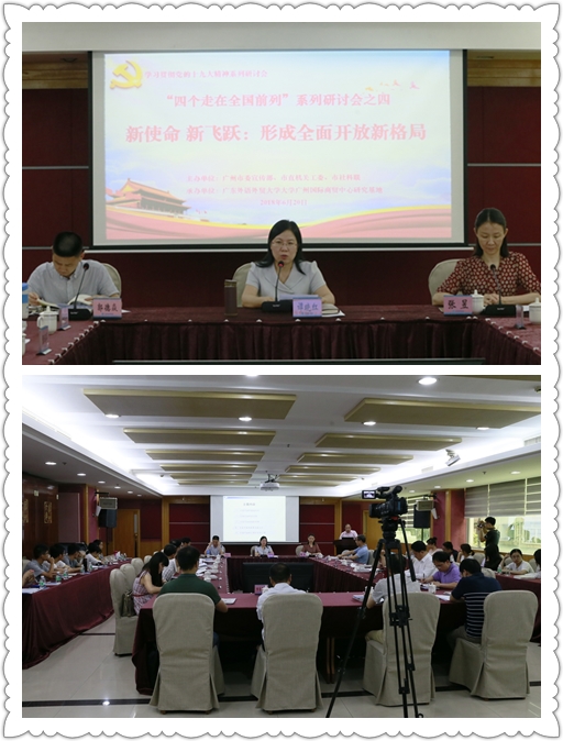 6月20日,由广州市委宣传部、市直机关工委、市社科联主办,广东外语外贸大学广州国际商贸中心重点研究基地承办的“四个走在全国前列”系列研讨会之四—“新使命·新飞跃:形成全面开放新格局”在广州市社科联第三会议室举行。广州市社科联党组成员、副主席谭晓红、郭德焱,广州市商务委员会原主任肖振宇、广东外语外贸大学原副校长董小麟、广州市社科院副院长杨再高、暨南大学发展规划处处长杜金岷、广东财经大学商务流通研究院院长王先庆、广州市商务委员会副巡视员张丽萍、广州市金融局政策法规与规划处处长欧俊青,以及来自广东外语外贸大学、广州市社科院、广州市商务委员会、广州市金融局等高校、科研单位与政府部门的专家学者、广州地区媒体记者40余人参加了本次活动。会议由广东外语外贸大学广州国际商贸中心重点研究基地主任张昱教授主持。