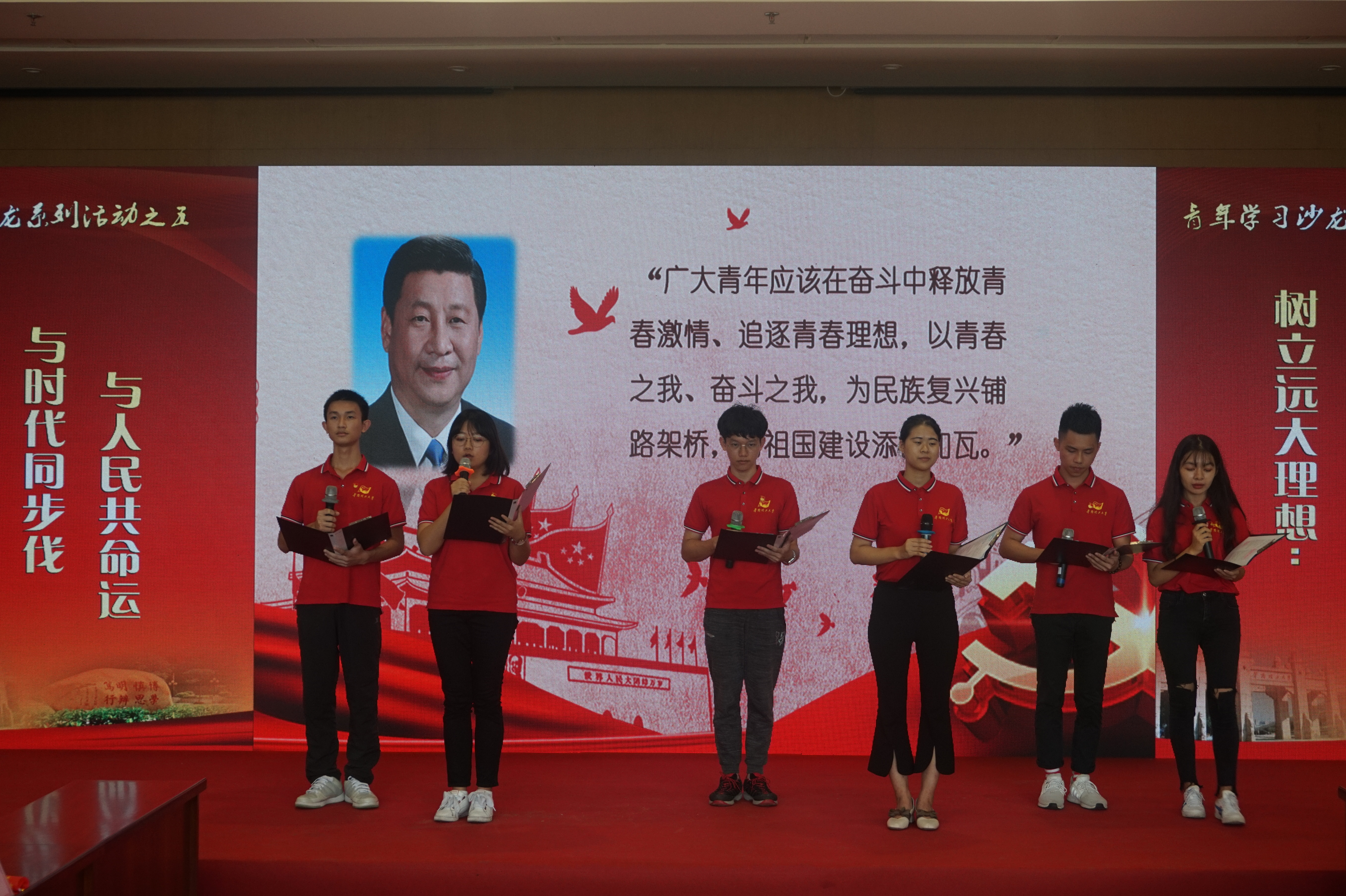 华南理工大学“习语心传”学生党员宣讲团陈海标、王婧等同学作题为《青春无悔,勇往直前》的经典诵读。他们庄严宣誓:“我们定不负党和国家的期望,立鸿鹄志、做奋斗者,脚踏实地、知行合一,扎根人民、奉献国家,努力争做新时代的弄潮儿!”