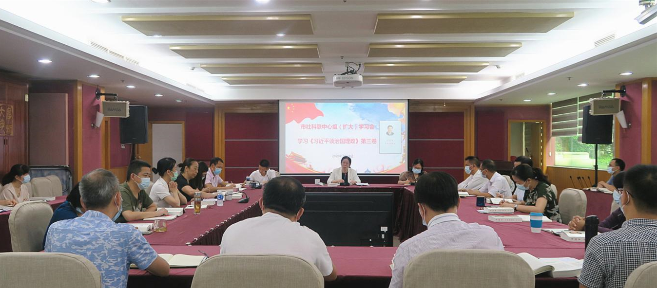 7月24日上午,市委宣传部常务副部长,市社科联党组书记、主席曾伟玉同志主持召开党组理论学习中心组(扩大)学习会,专题学习《习近平谈治国理政》第三卷,党组成员、专职副主席谭晓红、郭德焱同志出席学习并作交流发言,市社科联机关和城市观察杂志社全体党员参加了学习会。