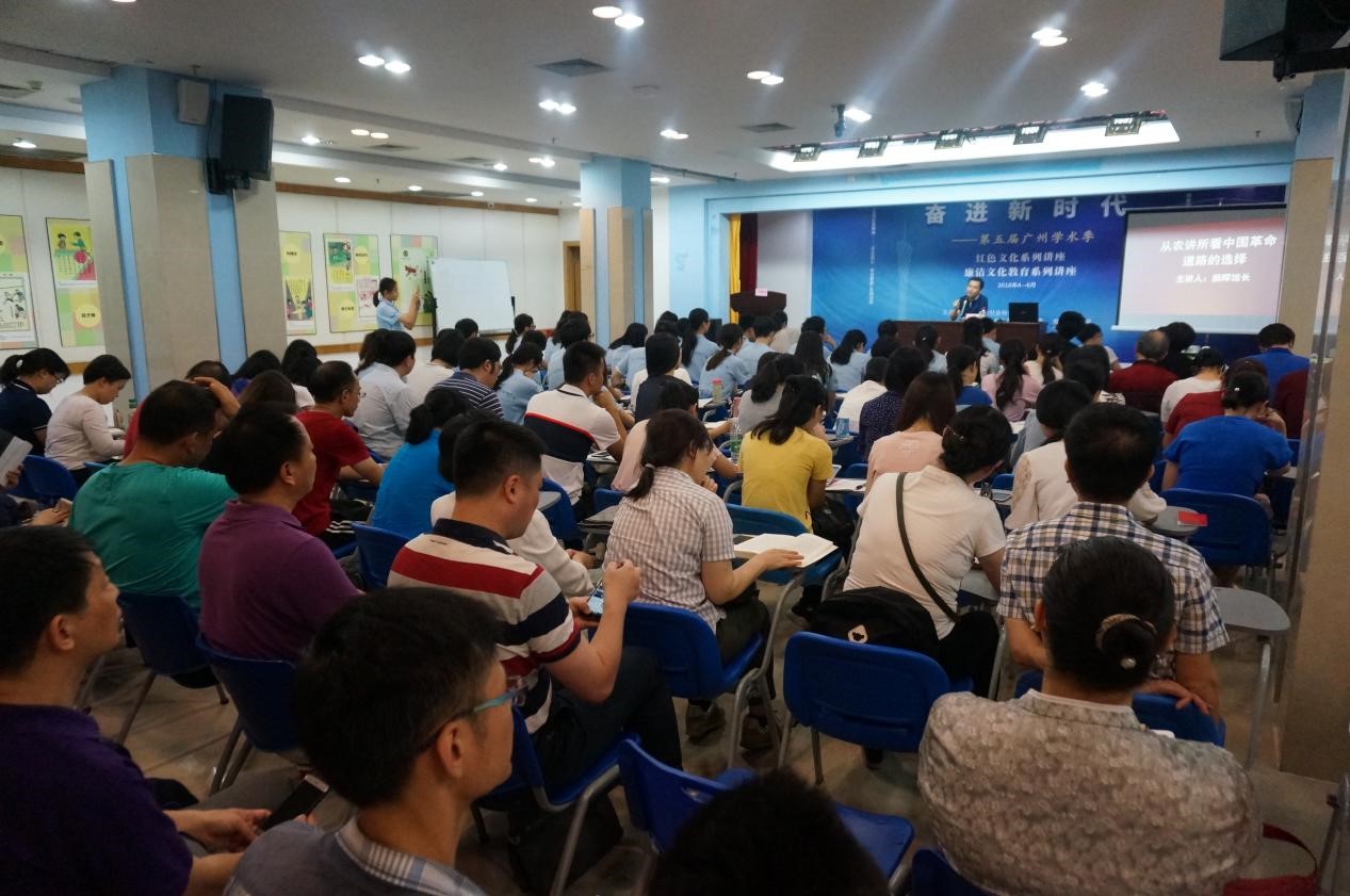 5月27日上午,由广州市社会科学界联合会主办,海珠区图书馆承办的第五届广州学术季红色文化系列讲座在区少儿图书馆举行了第7期。广州农讲所纪念馆馆长颜晖给我们带来了题为《从农讲所看中国革命道路的选择》的讲座。区文广新局机关党支部党员、广州市第九十七中学、海珠区启能学校、海珠区宝玉直实验小学、海珠区邓世昌纪念小学等学校的党员教师、华南农业大学青年马克思主义者培养工程学员、本馆读者等110多名观众参加了本期讲座。