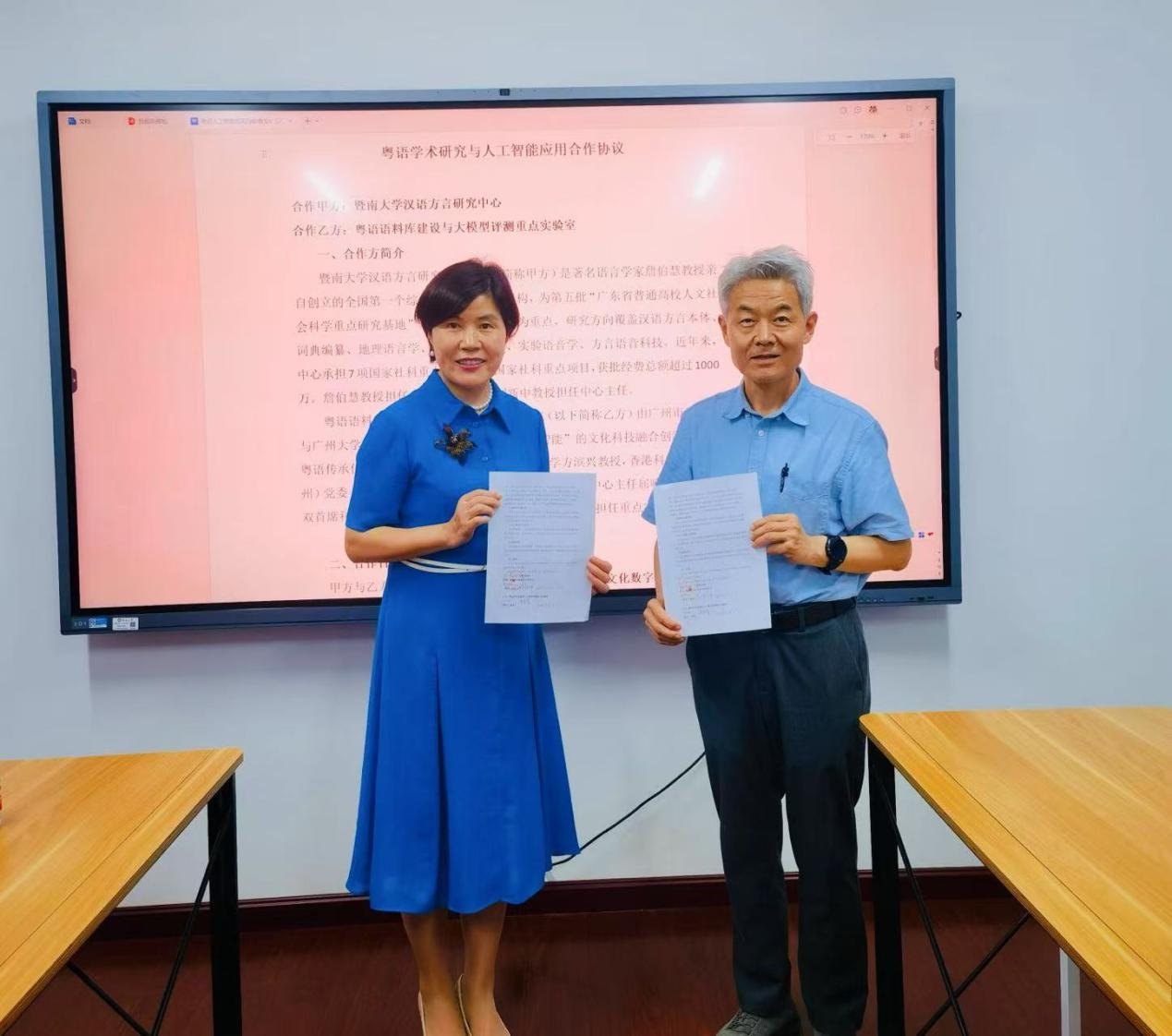 当天,暨南大学汉语方言研究中心主任刘新中教授与粤语语料库建设与大模型评测重点实验室齐佳音教授共同签署了《粤语学术研究与人工智能应用合作协议》,启动了双方在粤语基础研究、粤语语料库共建、岭南文化数字化、人工智能产品研发等方面的合作。