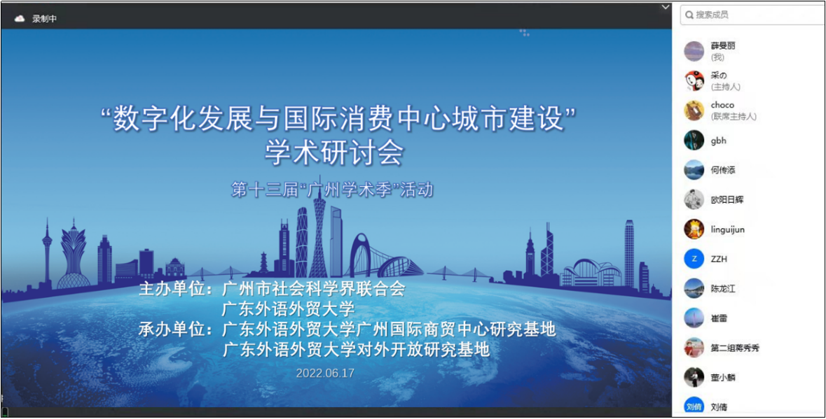 2022年6月17日上午,由广州市社会科学界联合会、广东外语外贸大学主办,广东外语外贸大学广州国际商贸中心研究基地、对外开放研究基地承办的“数字化发展与国际消费中心城市建设”学术研讨会在广东外语外贸大学大学城校区,以线上加线下的方式举行。本次研讨会是第十三届广州学术季“推进数字化、绿色化、国际化转型”系列研讨活动之一。