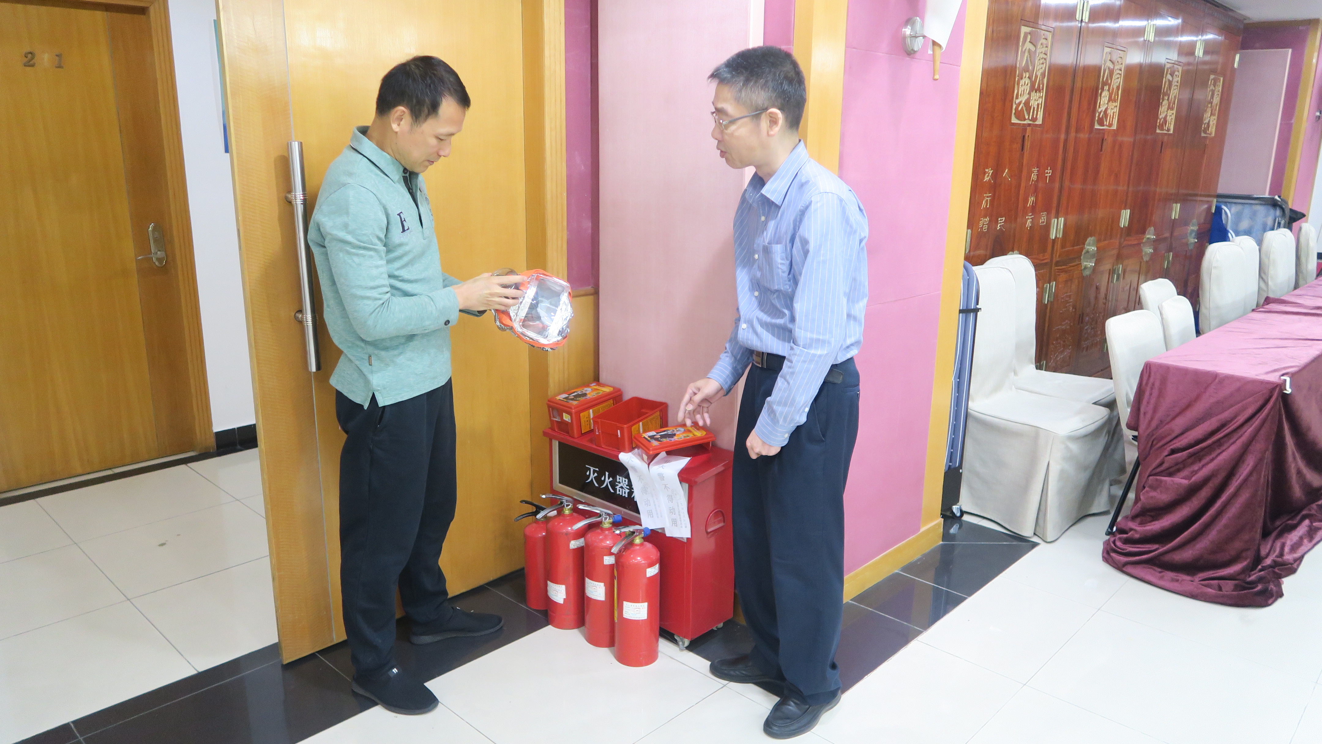 李伟同志带队检查了我会公共场所灭火器材、防毒面罩等设施,随后又对各部门负责人安全生产责任落实情况进行了了解,指出了灭火器充气过满、人员安全生产意识不强等问题。