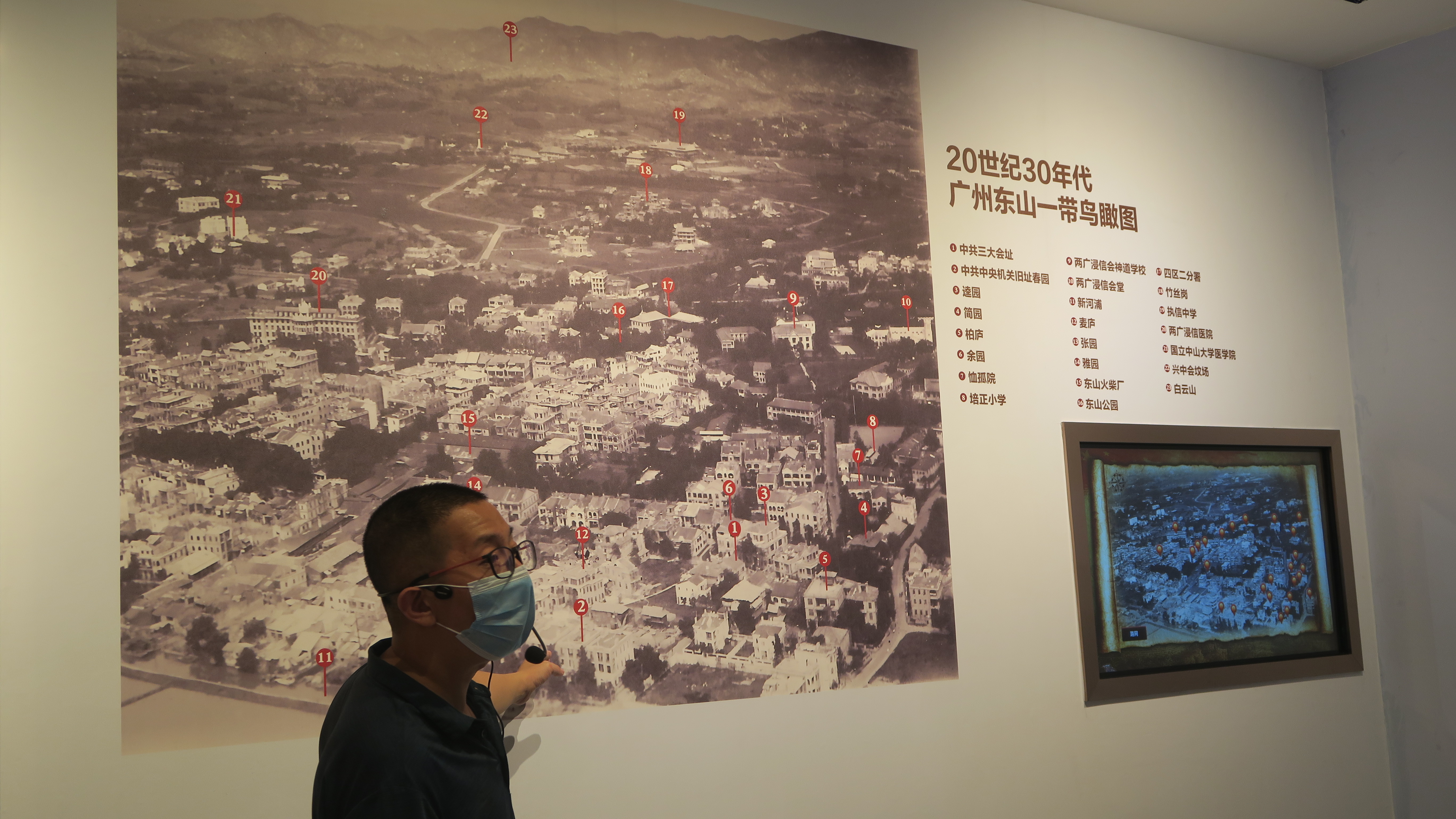 展馆一楼有一张放大的20世纪30年代广州东山一带鸟瞰图,被认为是目前发现的唯一一张可以看到三大会址房屋的照片。党员们围聚在照片前认真聆听讲解员的介绍:“当时中共三大是秘密召开的,而且会址房屋毁于1938年10月侵华日军飞机对广州的轰炸中,因此中共三大会址的所在地一度成谜,直到1972年中共三大代表徐梅坤到广州寻访才揭开了谜底。2006年,经考古勘查最终确认中共三大会址就在这里。”