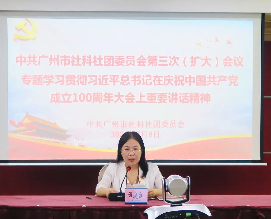 2021年7月8日上午,中共广州市社科社团委员会第三次(扩大)会议在广州市社科联第三会议室召开,专题学习贯彻习近平总书记在庆祝中国共产党成立100周年大会上的重要讲话精神。会议以“线上+线下”相结合的方式进行,所属学会专家代表、党委委员代表、党支部书记代表分别作主题交流发言。市社科社团党委委员及所属党支部书记、党员参加会议。会议由市社科联党组成员、专职副主席,市社科社团党委书记谭晓红同志主持。
