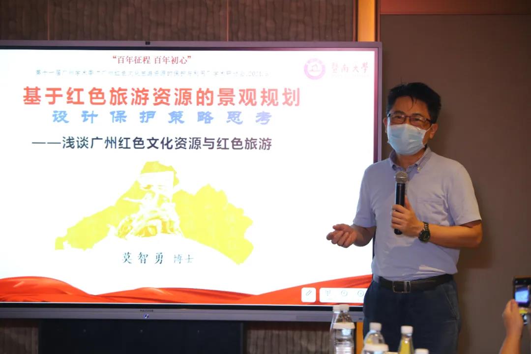 在主题演讲环节,暨南大学新闻与传播学院教授莫智勇教授以《基于红色文化旅游资源的景观保护与设计思考——以广州红色文化遗址保护利用开发为例》为题,对广州红色文化旅游资源进行了梳理,提出了红色文旅景观设计保护的对策思路,强调要科学治理、依法治理,一是要科学规划,坚持保护与开发并重;二是要促进红色旅游与生态旅游协同发展;三是要探索寓教于乐、特色化与体验感、参与感相结合的红色文旅开发与保护的可持续产业发展策略。