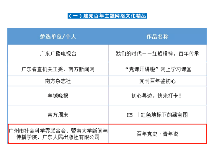 日前,由省委网信办、省文明办联合主办的第八届广东省网络文化精品宣传推广活动圆满收官。广州市社科联牵头策划创作的“百年党史•青年说”音频传播展示项目获评“建党百年主题网络文化精品”。